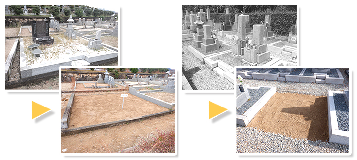 お墓じまいでは、① 遺骨を新しい場所に移し、② 遺骨を移した後のお墓を更地にして、霊園の管理者に墓所の使用権を返還することになります。
